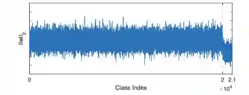 作者自己建立了一个人脸数据集,包含两部分,第一部分大概包含 20k 个 id,每个 id 有 50-100 张图片,第二部分包含 1k 个 id,每个 id 仅有 20 张图片。如果在这个数据集上使用不加 weight normalization 的 softmax,得到的结果如下。