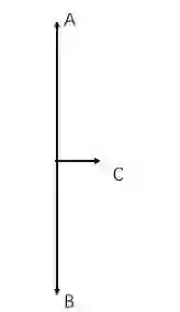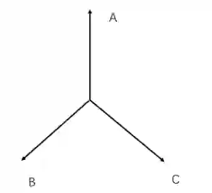 再举一个非常极端的例子。假设有一个三个人的分类问题,其中 A,B 两个人各有 100 张照片,而另外一个人 C 的照片只有 5 张,那么训练这个三分类问题,最终将其 weight 的每一列在二维空间上做一个可视化,就应该是下图这个样子。
