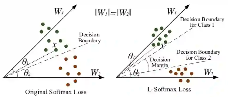 的夹角。先简化问题,假设 class weight 被 normalize 了,此时夹角就决定了样本 x 被分到哪一类。左边是原始的 softmax loss,分界面的 vector 处于两类 weight 的中间,此时