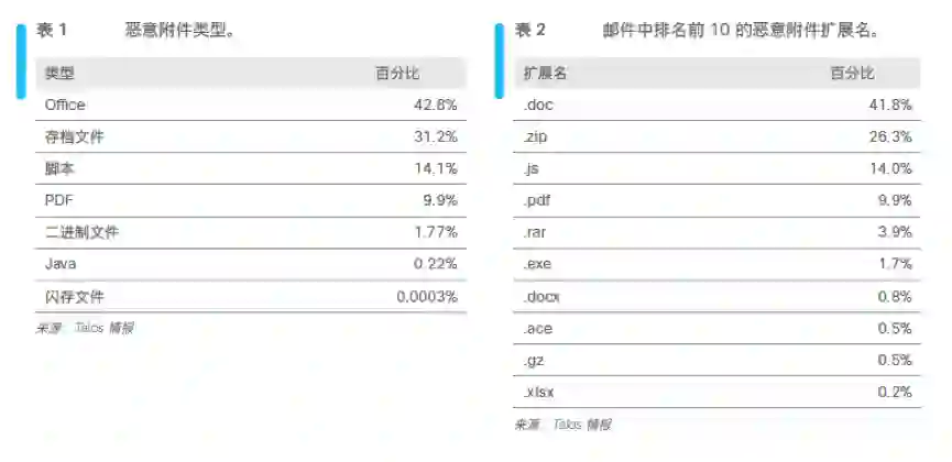 其中,在针对恶意软件进行统计后,《2019 思科网络安全报告系列-邮件安全报告》发现,邮件中最常见的恶意附件为Microsoft Office文档,42.8%的恶意文件来自Office,也就是说每五个恶意文件中就有两个是大众最为熟悉的Microsoft office文件,可以说在日常工作中无处不在。