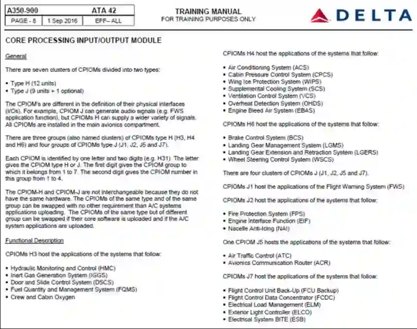 Scribd网站上的达美航空培训手册解释了A350的CPIOM应用程序是哪些。它们包括:告诉飞行员客机已消耗多少燃料的燃料数量及管理系统、机舱压力控制系统、机翼防冰系统、包括为客舱提供氧气供乘客呼吸等功能的发动机引气系统以及起落架伸缩系统。