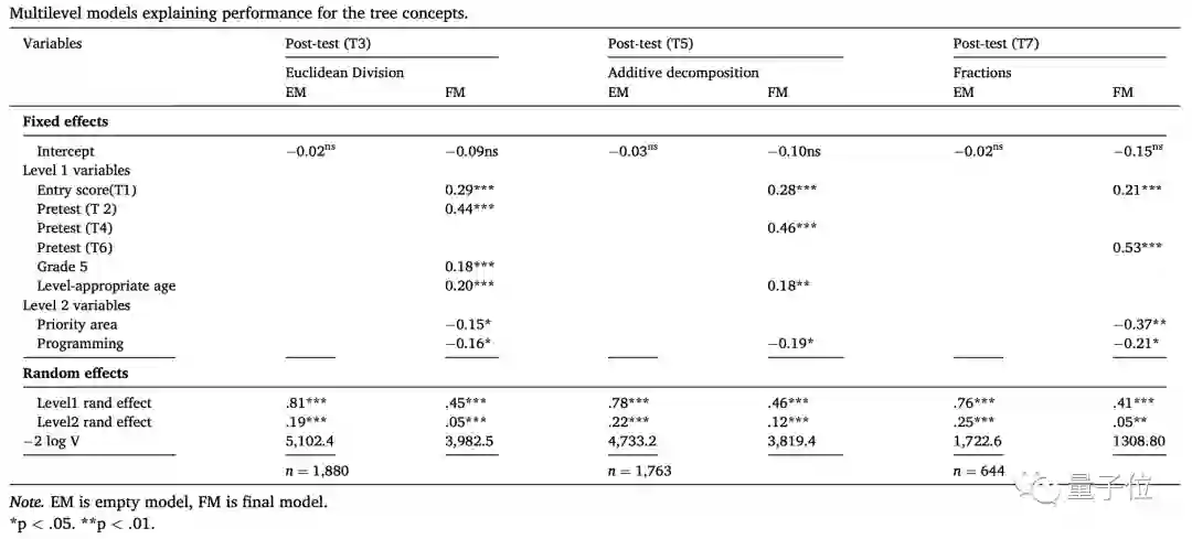 而相比上普通数学课的小孩,上编程数学课的小孩影响都是负数:编程思维对最终性能的平均影响为−0.16 SD(欧几里得除法)、−0.19 SD(加性分解)和−0.21 SD(分数)。
