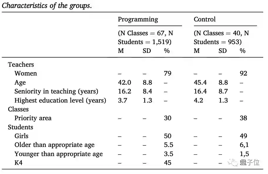 以学校为单位,学生随机分配到两个组别:编程组(28所学校,68个班级,1519人)和对照组(18所学校,41个班级,953人)。