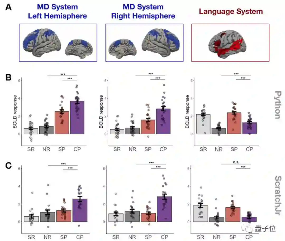但是在MIT神经科学家发现,当人在读代码(Python)时,似乎同时激活了MD网络的左右两个部分。