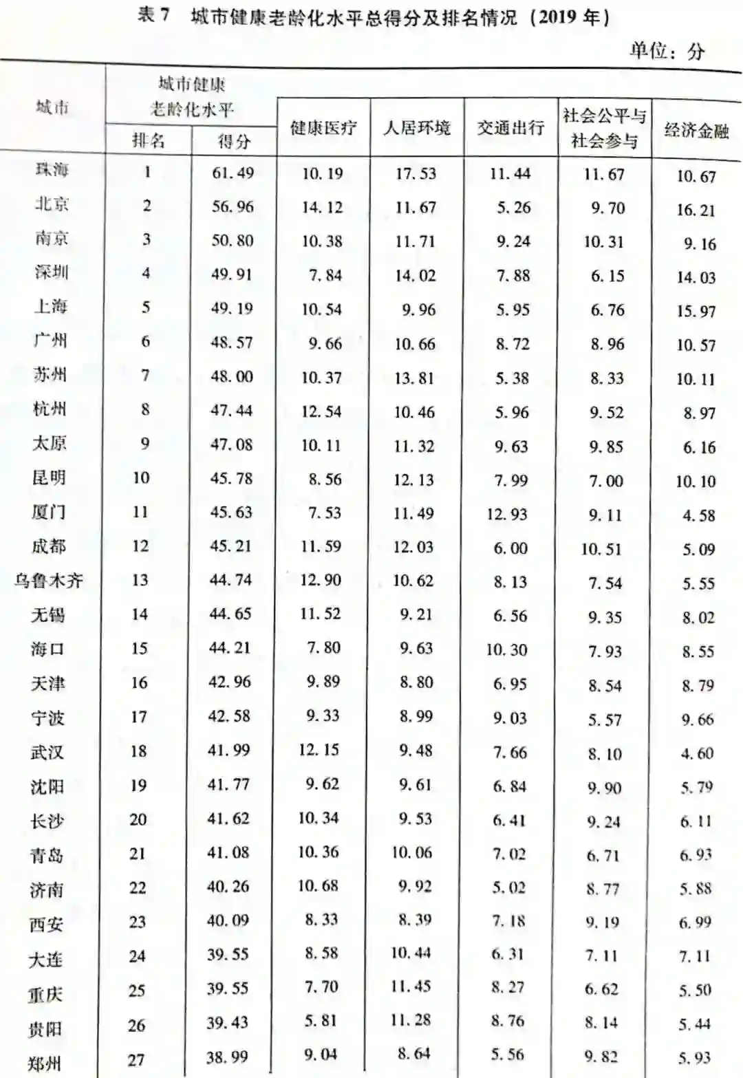 中国城市总体上应对老龄化的能力有限,排名第一的珠海是唯一得分过‘及格线’(60分)的城市。