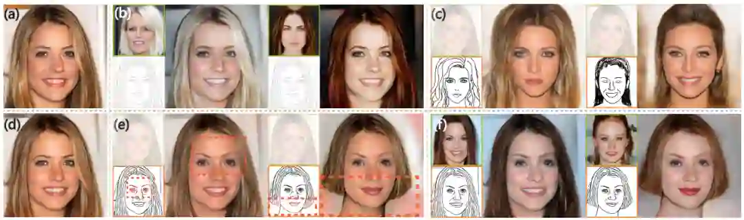 从图3中可以看出,在给定来自同一人(a)的几何和外观特征时,DeepFaceEditing 可以完美重建输入人脸(d)。与此同时,当改变对应的外观参考图片,DeepFaceEditing可以改变肤色、发色(b),生成个性化滤镜。用户也可以通过编辑草图,对人脸进行细节的编辑(e)。同时,该方法也可以通过手绘的草稿,生成具有特定外观的真实人脸(c)。