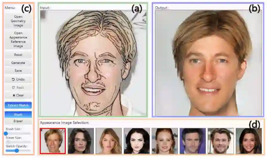 DeepFaceEditing可以从真实照片中提取草图,用户通过编辑草图,可以对人脸进行细节编辑。如图5界面中的(a),即为用户对图像提取到的草图编辑后的结果。(d)为外观参考图像列表,用户通过选取/加载外观参考图,实现人脸的肤色、发色等外观信息的编辑。控制菜单栏(c)中包含几何/参考图像加载,橡皮笔刷、控制笔触大小等功能。根据编辑的几何和选择的外观,最终合成的人脸编辑结果将实时展示在(b)上。