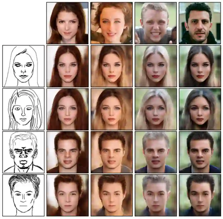 鉴于DeepFaceEditing将图像解耦为几何表示和外观表示,因此,在草图到真实人脸生成的过程中,可以添加外观控制。如图8所示,结合DeepFaceDrawing的流形投影技术,可以从手绘的草图生成具有不同外观特征的真实人脸图像。
