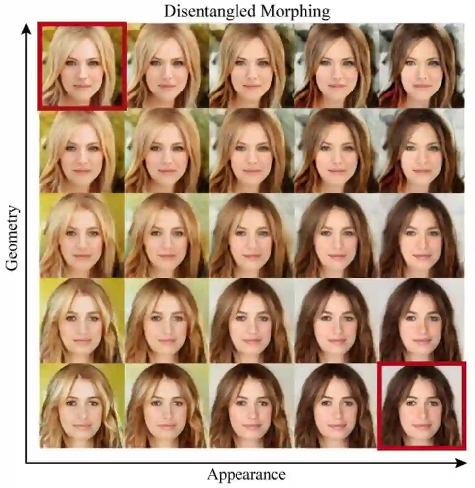 同时,基于解耦的优势,可以实现对不同图像的几何和外观特征进行插值,并进一步利用插值后的特征生成人脸图像,实现人脸变换,结果如图9所示。