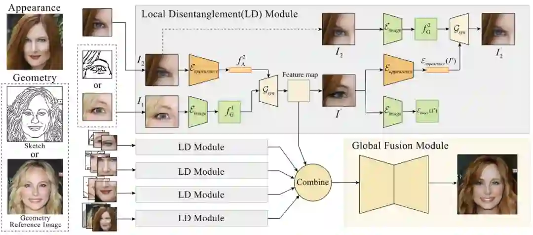 DeepFaceEditing 采用局部到全局的方法,将人脸的几何特征(Geometry)和外观特征(Appearance)进行解耦(Disentanglement),能分别对真实图像的几何细节和外观特征进行编辑,这是该方法行之有效的原因。