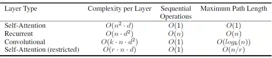 中给出了不同层模型(self-attention\RNN\CNN)在层复杂度、序列操作、最大路径长度的对比,结果如下图所示。