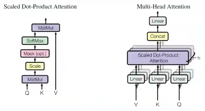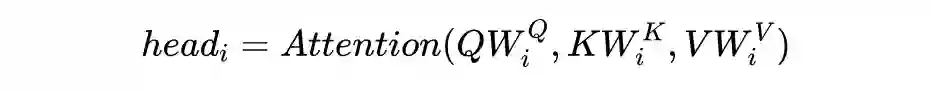 注意力并行化的代表,缩放点积注意力在前面小节中已经提过,多头注意力不仅计算一次注意力,而是并行化计算多次注意力,这样模型可以同时关注多个子空间的信息。计算公式为: