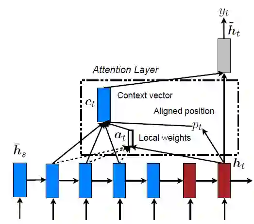 Local attention 相对于 global attention 直观的感受,专注于小窗口的上下文,也就是不考虑所有的编码隐层状态,模型结构图如下所示。为实现该想法,要在每一时刻解码时构造一个位置变量