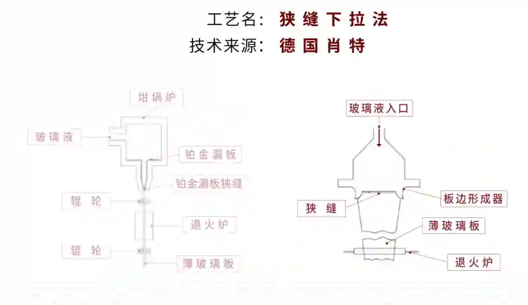狭缝下拉法是目前德国肖特主要采用的玻璃制作工艺。狭缝下拉法的原理是,将均质的玻璃液导入坩埚炉中,坩埚炉下面装有一个铂金漏板,玻璃液在重力作用下,从铂金漏板狭缝中流出,经过辊轮拉成超薄玻璃。