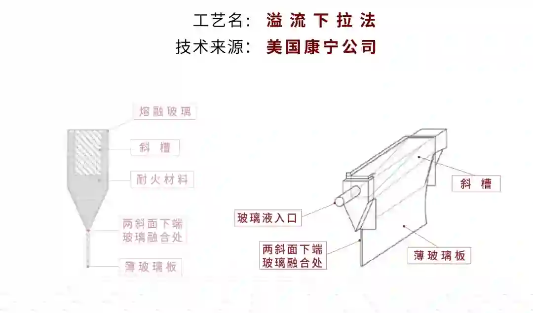 溢流下拉法由美国康宁公司首次提出,原理就是将熔化的玻璃液注入溢流槽内,随着玻璃液溢出到两侧后,在溢流槽下面汇合成连续的玻璃带,然后下拉、退火,生产出玻璃。