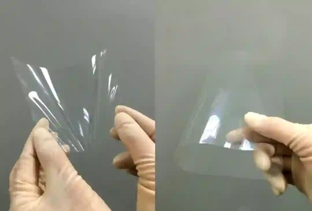 就拿盖板材料来说吧,一开始各家都只能用CPI膜,也就是无色聚酰亚胺。在当时的条件下,这种类似塑料的材质确实可弯折,不过比较厚,有220μ,而且平整度不太好,透光率也比较渣,在87%-90%之间。虽然名字里带着“无色”,可实际上却有淡淡的黄色,所以在使用过程中观感并不是那么好。