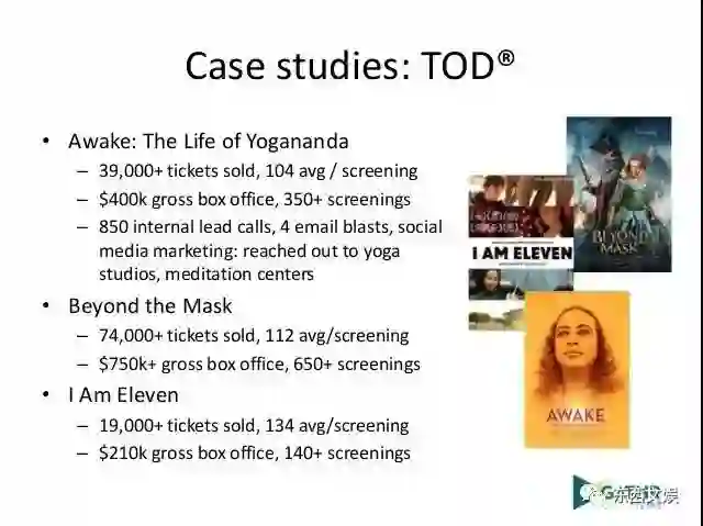 通过TOD发行的电影包括《Girl Rising 》(2013年票房第四的纪录片),《Awake: The Life of Yogananda 》(获140万美元票房),《Beyond theMask》(700 +次放映),《The Square》(2014年奥斯卡提名),《The Tale of the Princess Kaguya》(2015年奥斯卡提名)和《TheAnonymous People》(200 +次放映)。