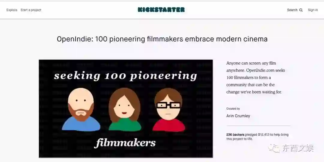 2009年,Openindie在众筹平台kickstarter上发起了一项众筹,旨在募集1万美元的资金和100位电影先锋制作者加入其网站。这项众筹在当时引发了一些讨论并最终获得了来自236位支持者的12413美元资金。