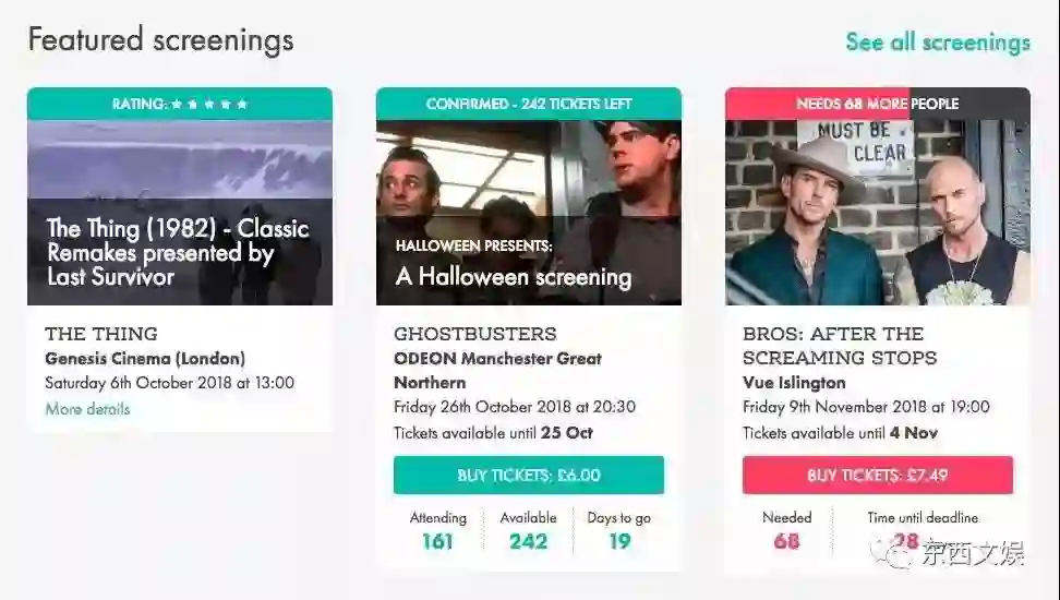 基于此,一种基于用户需求与社交的发行放映形式正在这几年间悄然兴起,在北美、英国、澳大利亚等区域市场均有活跃着的初创公司存在,而他们的核心即为Theatrical On Demand。