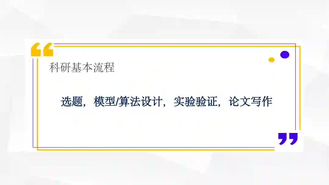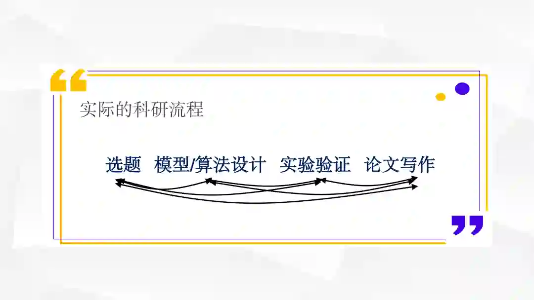 这里我想分享一些科研工作的真实情况。比如像刚刚说的,科研流程有选题、设计算法模型、实验验证、论文写作这四步。但这是理想化的情况,现实里不太可能一次性从头走到尾。一般是做了实验,发现模型不work要去改;或者实验发现这个算法和实验可能行不通,要全部推倒重来,换一个题目;也有可能是论文写了一半,发现要补某个实验,或者说这个模型哪一块不太严谨。这样来回往复,都是有可能的。