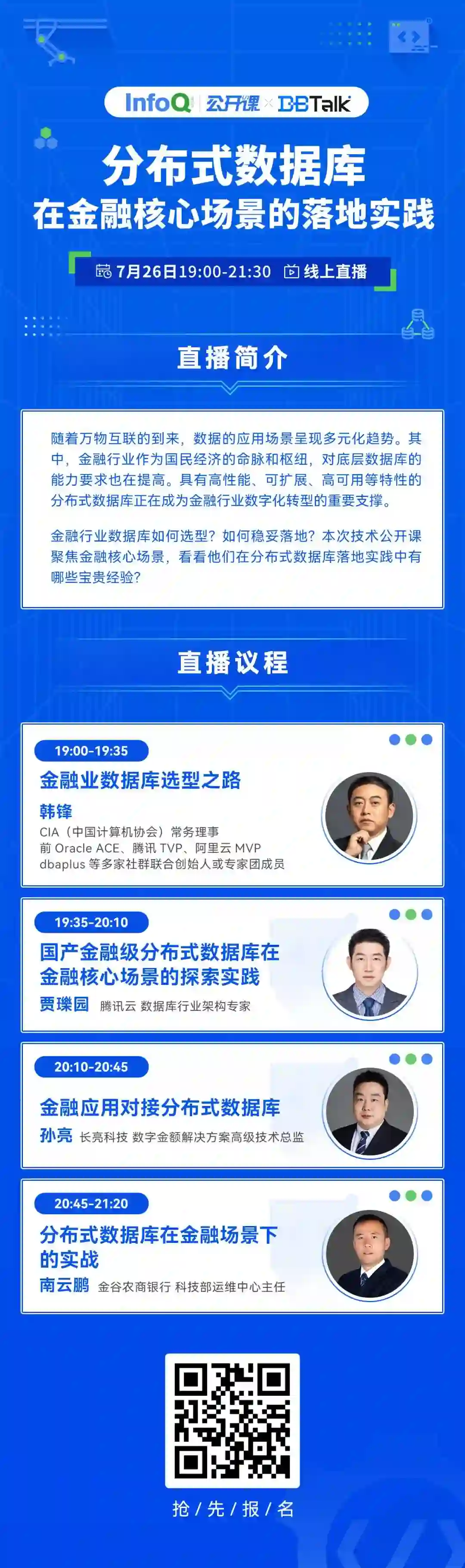 7 月 26 日 19:00-21:30,我们邀请了 4 位嘉宾,带来 4 场精彩的线上主题分享,解答大家关于金融行业分布式数据库选型、落地实践等实际问题。