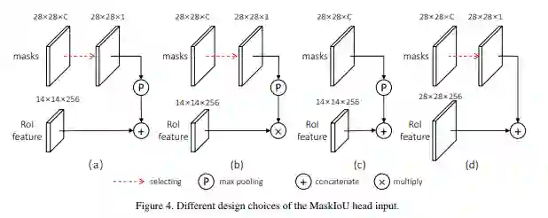 同时作者还做了对比实验,验证不同的MaskIoU输入对性能的影响。文章列举了4种输入方式: