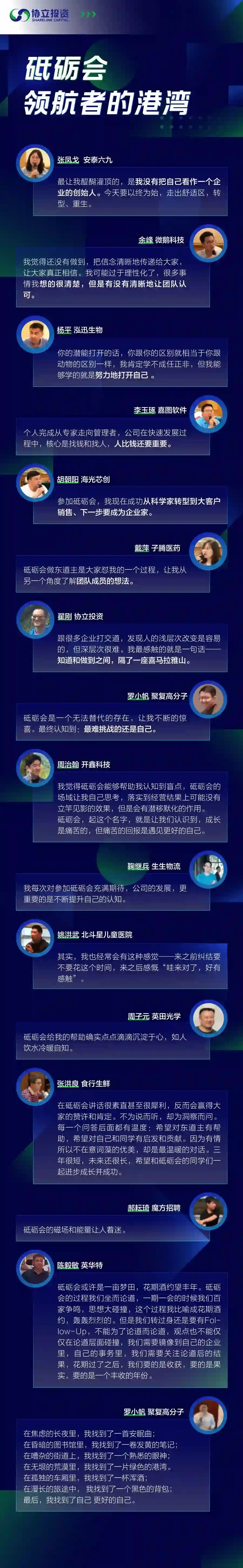 从包括协立团队在内的全员“将信将疑”,到“好评如潮”,是因为砥砺会作为协立投资与被投项目之间的联系纽带和中枢的角色的作用得到了认可、支持和帮助创始人成长的初心得到了信任和肯定。王鹂担任教练的砥砺会至今已经有3期了,每期12-15位创始人,全部是协立被投企业,共计40多位创始人先后在砥砺会学习。