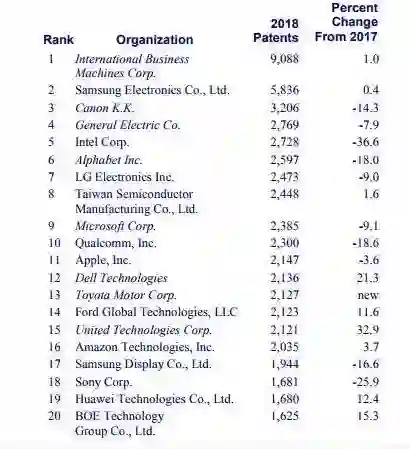 具体来看,排名前20名的是:IBM、三星电子、佳能、通用电气、英特尔、Alphabet、LG电子、台积电、微软、高通、苹果、戴尔、丰田汽车、福特、美国联合技术公司、亚马逊、三星显示器、索尼、华为和京东方。