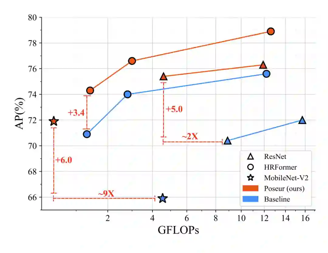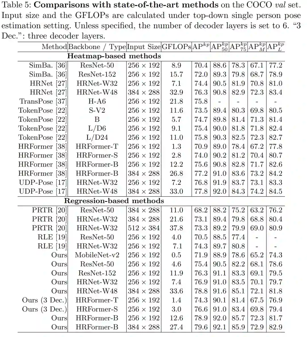 首先从论文标题也可以看到,Poseur是属于Regression-based方法。我认为这篇工作最大的亮点在于,它在Regression方法和Transformer的结合上进行了细致的设计,最终在COCO val上刷到了AP79.6,test-dev上AP78.3,相较于之前的SOTA如HRFormer的77.8/76.2,和我介绍过的ViTPose取得的79.8/78.4已经完全不遑多让了。作为一种Regression-based方法,Poseur在计算量和运算速度上有着显著的优势,并且能用MobileNetv2作为backbone取得媲美ResNet50+SimpleBaseline的效果。