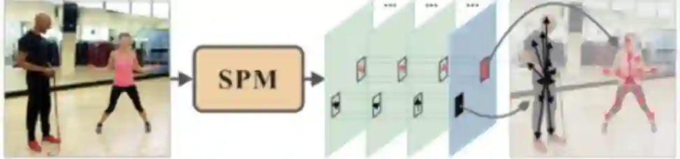第二点针对的主要是一些利用局部卷积特征来回归坐标值的方法,比如SPM和UDP等检测+回归形式的方法。这种方法的问题在于,回归坐标值时使用的特征取决于heatmap响应点,而响应点往往是目标的几何中心,这就意味着网络要用这块区域的特征去预测一个比较远的坐标,这会使得特征所在的位置,跟目标位置之间存在一定的偏移,这种偏移会增加学习的不确定性和难度。论文里给的这张图其实我觉得不够直观,我再配一张带箭头的或许能帮助大家更好理解,SPM方法是用人体中心点那一块的卷积特征去预测箭头所指的位置: