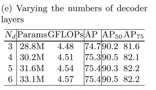 在DETR中也指出,后面的decoder实际上是在做一个coarse-to-fine的过程,即对预测结果进行逐层精炼,因此decoder除了可以定义多个层,也可以只定义一层,然后循环执行,把每次输出的结果又送给自己推理做一遍。本文的实验显示这样做在本文的方法上同样有效,能用一点点性能下降换取不错的参数量降低: