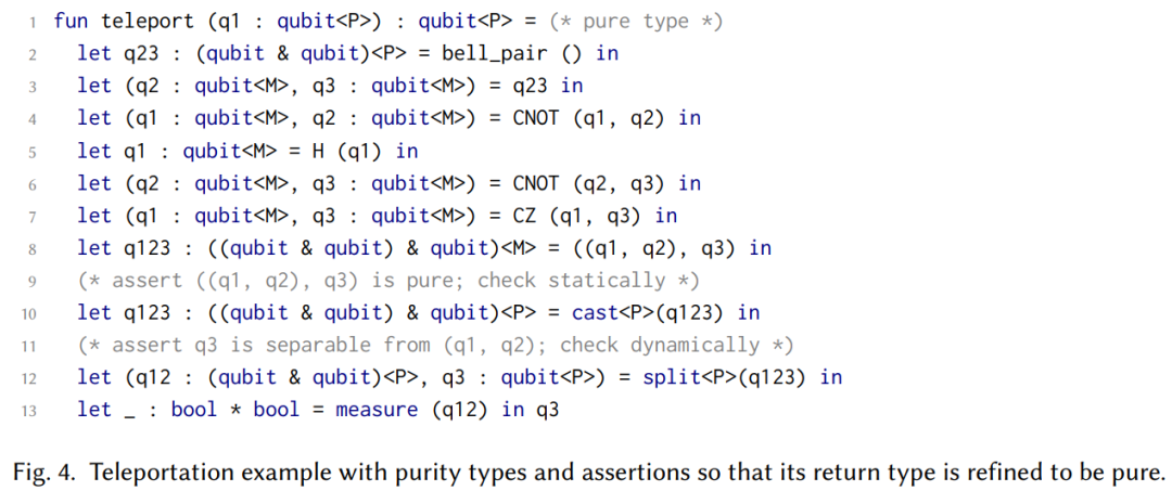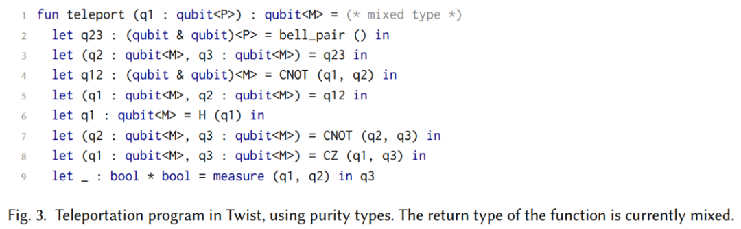 下图 3 展示了图 2 中的遥传程序,使用 Twist 编写,并且纯度带有类型注释。在 Twist 程序中,每个量子表达式都是纯净或混合的类型。其中,纯净表达式不受其他量子比特测量影响,而混合表达式可能受到其他量子比特测量的影响。