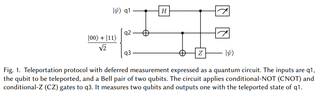 下图 2 展示了图 1 中量子电路的程序,它作为一个函数接受量子比特 q^1 并返回传送的输出,其中助手(helper)bell_pair 分配了一个贝尔对(Bell pair)。