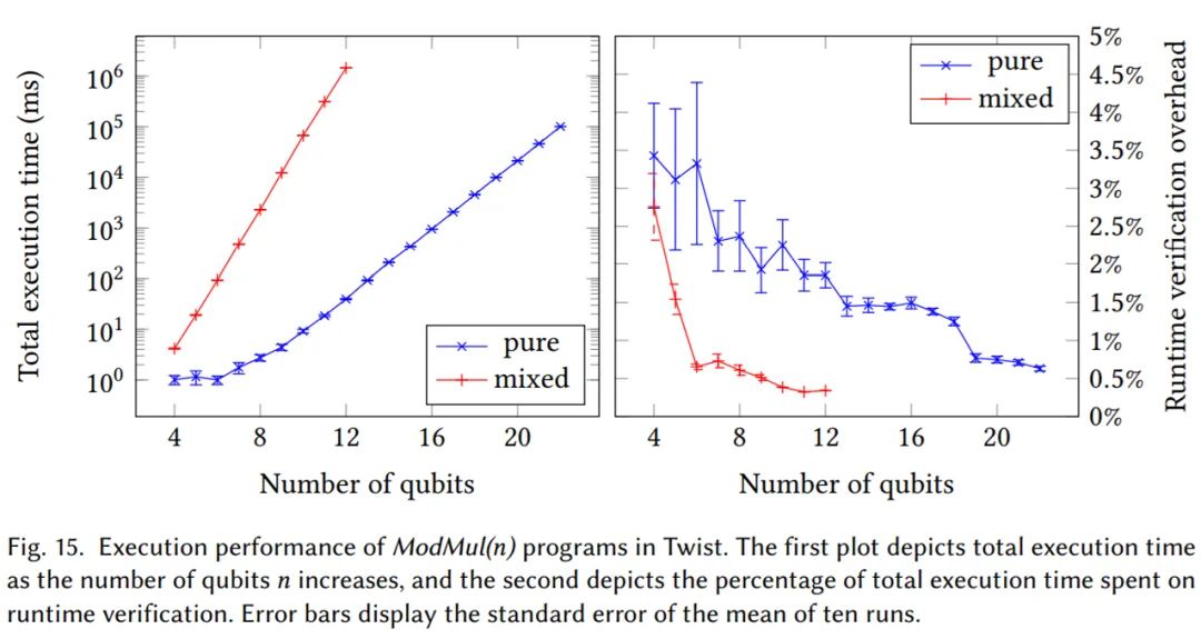 最后,研究者对 Twist 的类型系统进行评估,并在模拟中分析了一组基准量子程序,证明了 Twist 可以表达量子算法,捕捉编程错误,并支持现有量子编程语言不支持的程序,同时产生的运行时验证开销低于 3.5%