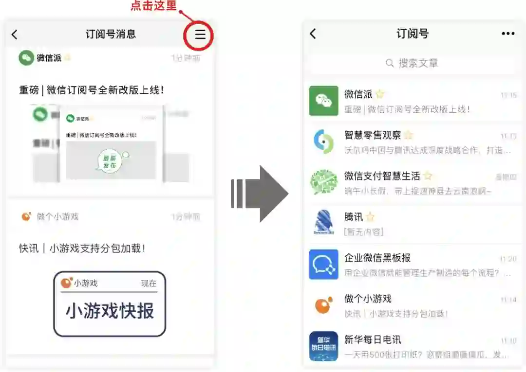 订阅号消息入口变浅了。操作步骤减少,视觉体验更丰富。对用户来说,点击即可阅读,更提高了阅读的体验和效率;