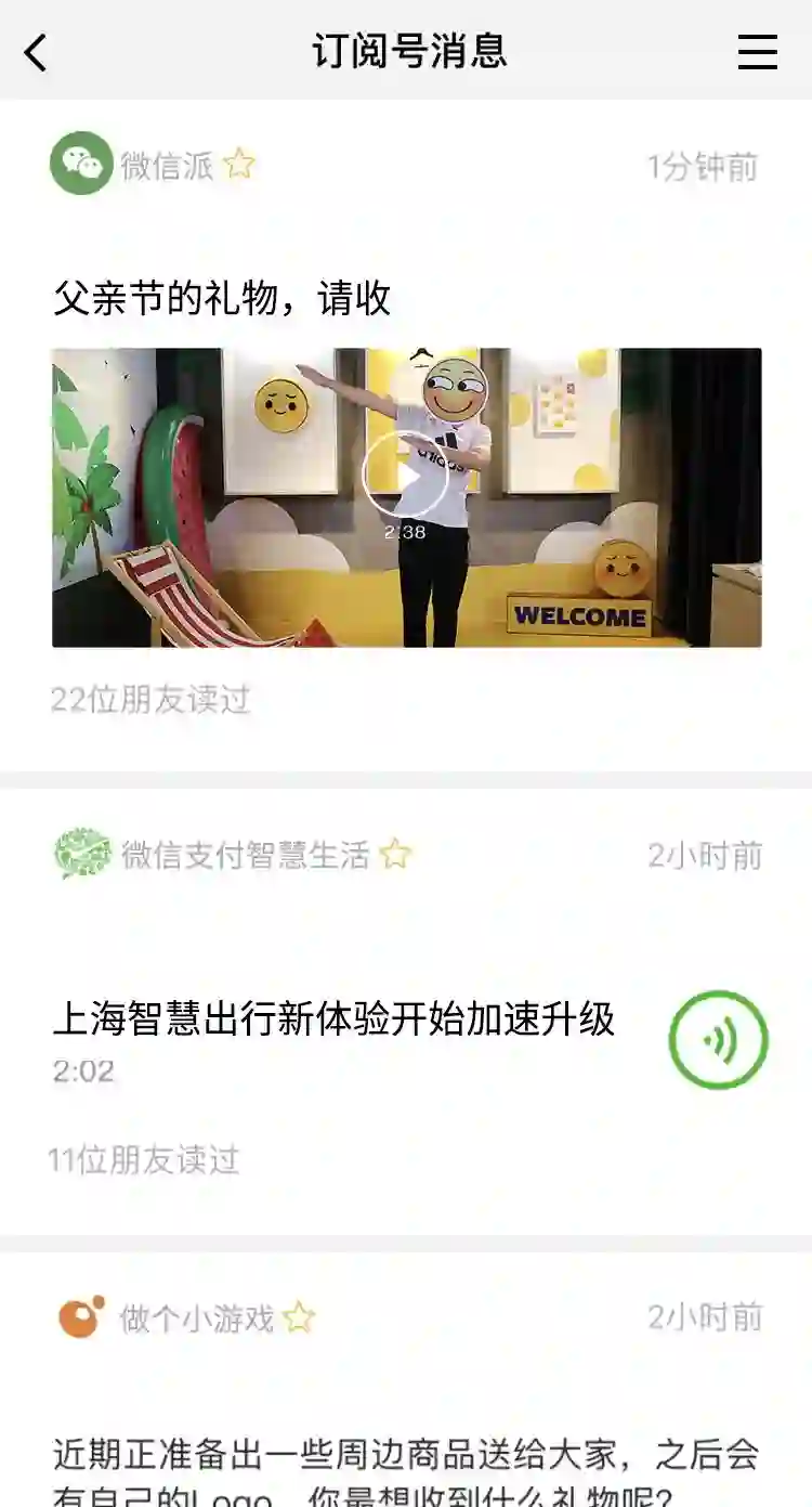 A:改版后的订阅号列表优化了视频、语音等富媒体的消息展示,用户可以看到推送的“标题+头图”形式的消息,视频、语音、文字以及多条消息都能直接展示在列表中,更能吸引用户阅读。