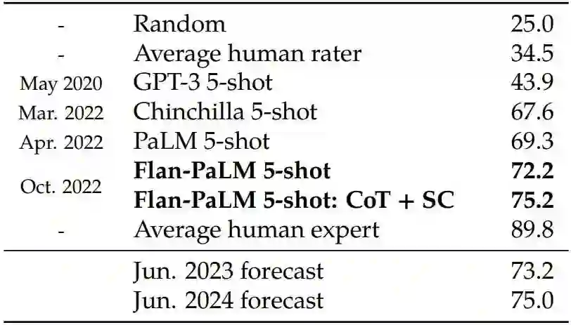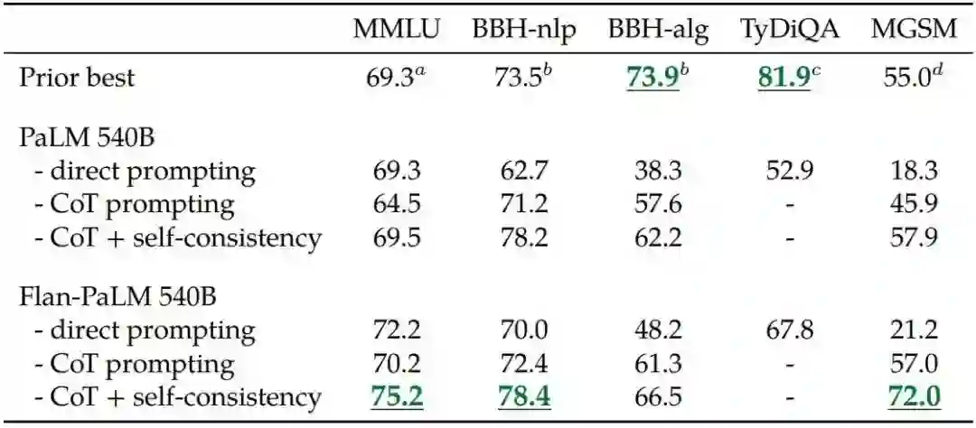 该研究使用 540B 参数模型训练 Flan-PaLM,将微调任务的数量增加到 1800 个以上,并包含思维链(CoT;Wei et al., 2022b)数据。经过训练后的 Flan-PaLM 优于 PaLM,在多个基准测试中达到了新的 SOTA。在推理能力方面,Flan-PaLM 能够利用 CoT 和自洽性(self-consistency;Wang et al., 2022c)在大规模多任务语言理解(MMLU; Hendrycks et al., 2020)上实现 75.2% 的准确率。