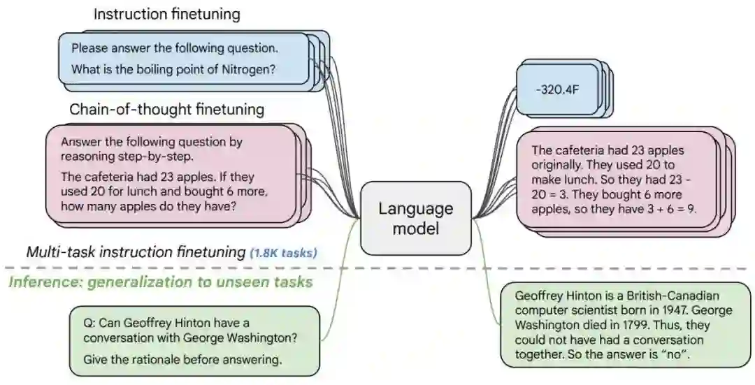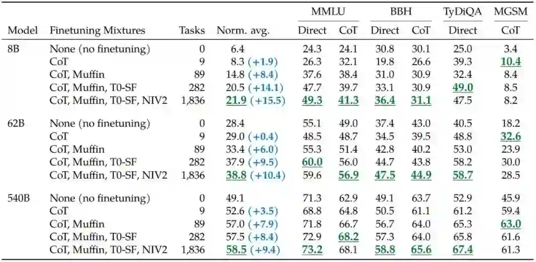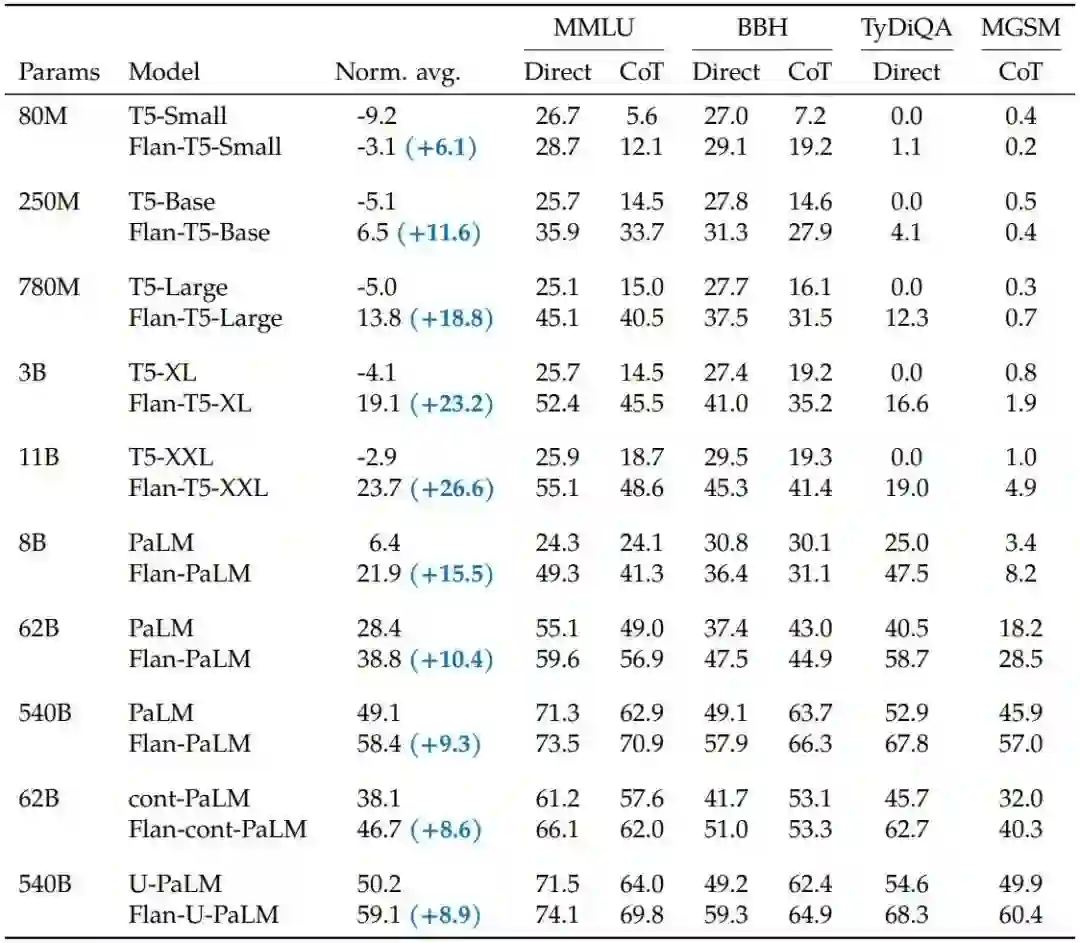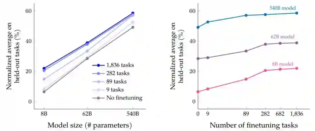 具体来说,该研究主要关注影响指令微调的几个方面,包括:(1)扩展任务数量,(2)扩展模型大小,以及(3)对思维链数据进行微调。