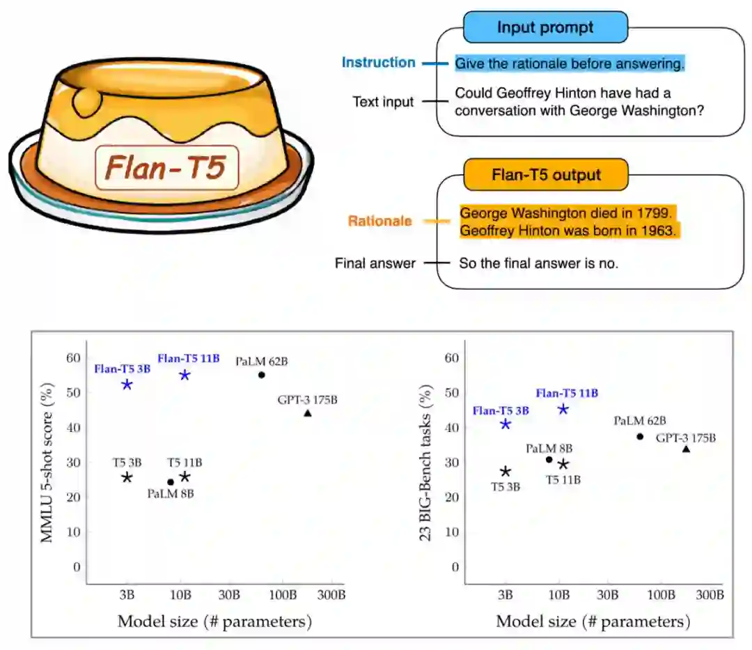 由此产生的 Flan-T5 对 1800 余种语言任务进行了指令微调,明显提高了提示和多步推理能力,30 亿参数跑基准就能超过 GPT-3 的 1750 亿参数。