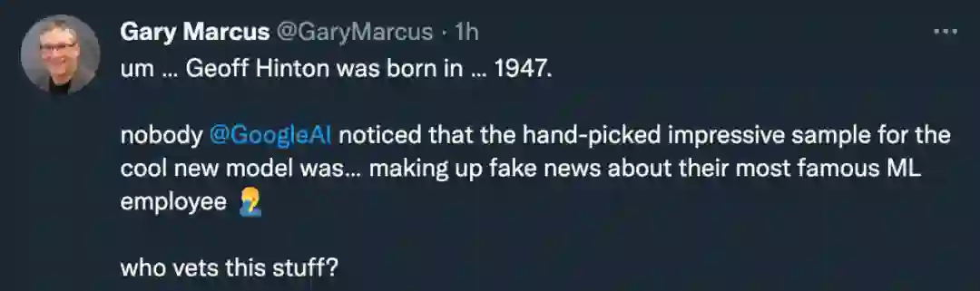 谷歌的模型为什么把谷歌自己的著名科学家 Geoffrey Hinton 的出生日期搞错了?人家明明是 1947 年出生的老前辈。