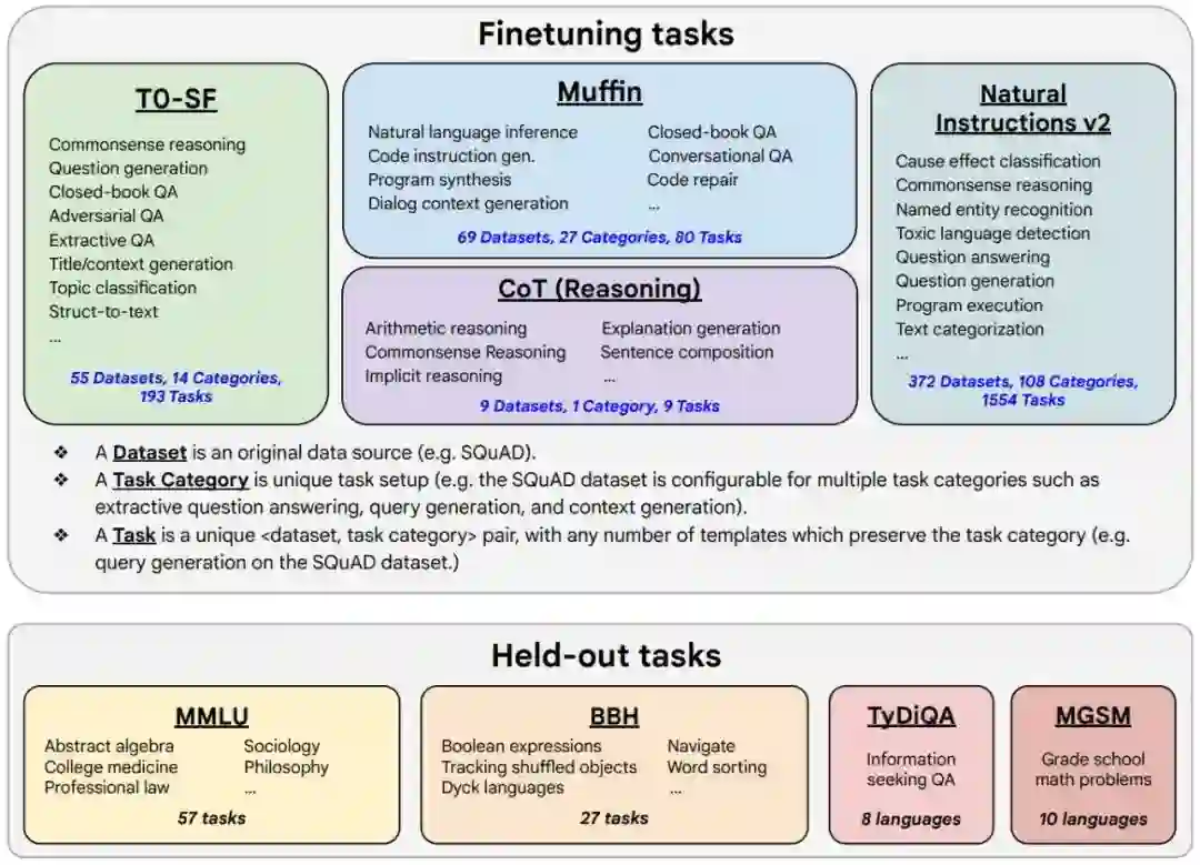 图 2. 微调数据包括 473 个数据集、146 个任务类别和共计 1836 个任务。