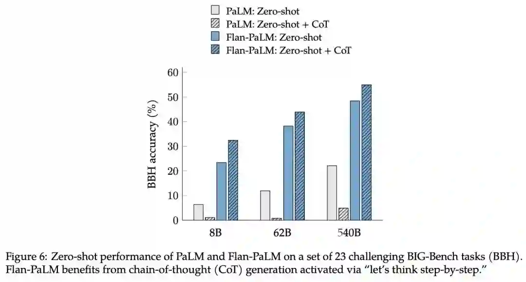 图 6:PaLM 和 Flan-PaLM 在一组 23 个具有挑战性的 BIG-Bench 任务 (BBH) 上的 zero-shot 性能。Flan-PaLM 需要通过「让我们一步一步思考」指令激活的思想链 (CoT) 生成。