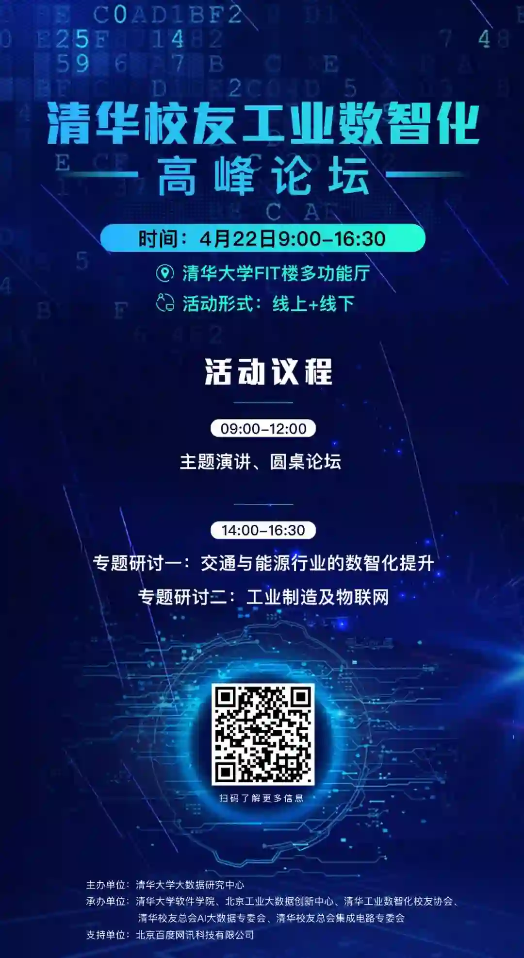 本文介绍了4月22日举办的清华校友工业数智化高峰论坛,欢迎扫码或
