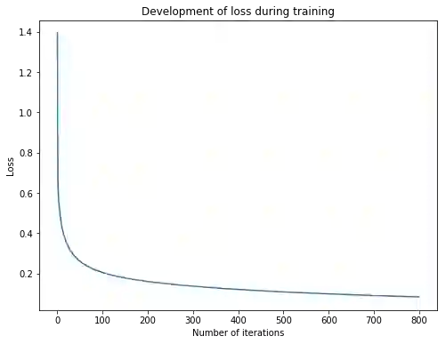 w_trained, b_trained, loss = regressor.train(X_train, y_train, learning_rate=0.1, n_iters=800, n_classes=4)