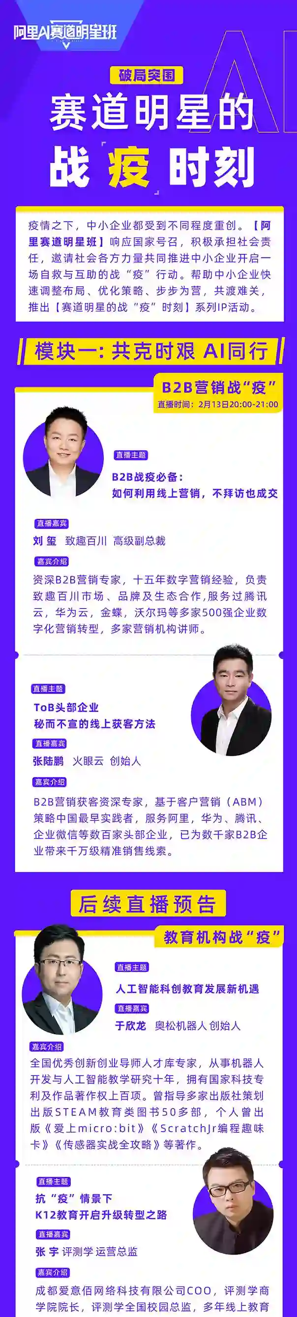 阿里AI赛道明星班邀请社会各方力量,号召中小企业开启一场自救与互助的战“疫”行动。帮助中小企业快速调整布局、优化策略、步步为营、共渡难关。