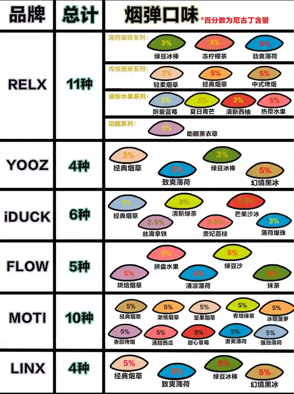即便没有一般香烟中最致命的一氧化碳和焦油,但从图表中可以看出,每种口味的烟弹,都含有致人上瘾的尼古丁。