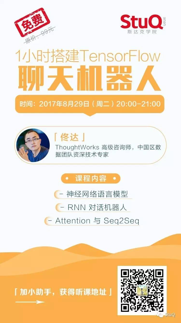 为了让对人工智能、智能机器人感兴趣的小伙伴们更深入掌握用TensorFlow搭建聊天机器人的方法,StuQ请来ThoughtWorks 高级咨询师,中国区数据团队资深技术专家——佟达老师,带大家“1小时搭建TensorFlow聊天机器人”。