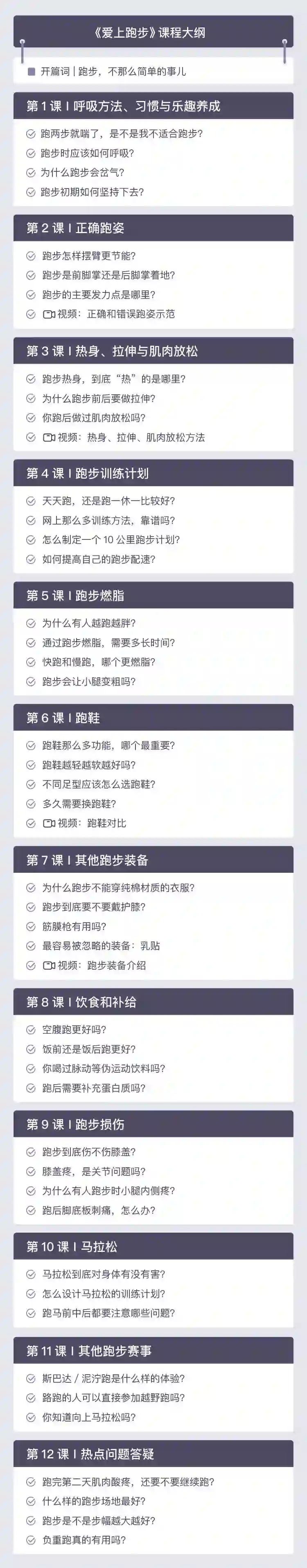 在课程里,我讲解的内容会涵盖跑姿、热身拉伸与放松、训练方法、跑鞋和装备选择、跑步燃脂、跑步补给、跑步损伤、马拉松和其他跑步赛事等内容,其中跑姿、拉伸热身还有肌肉放松的部分,我还特意录了视频,也放到了课程里。如果你还有想问的问题,也可以随时给我留言,或者给极客时间的运营反馈。