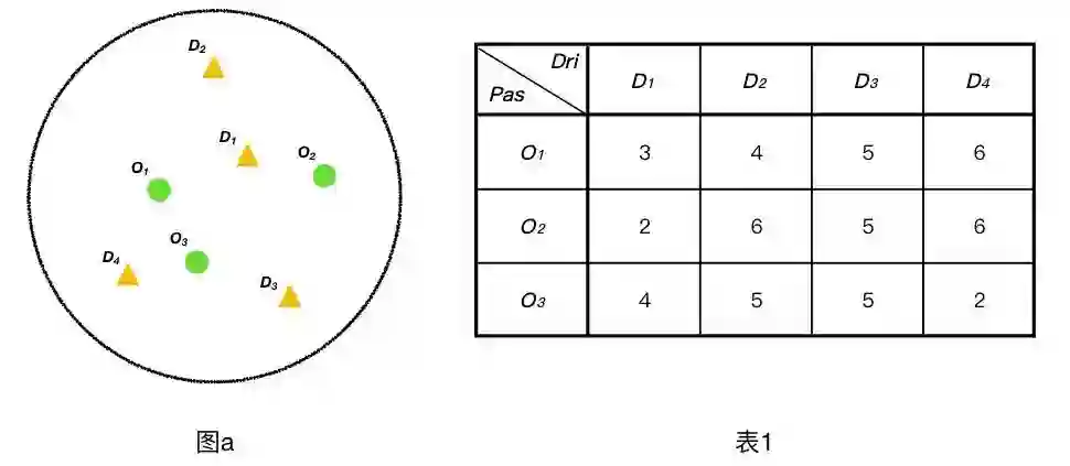 如下图a,假设在某可派单区域内,同时有O1、O2、O3三名乘客同时开始呼叫,此时在该区域内正好有四名司D1、D2、D3、D3。