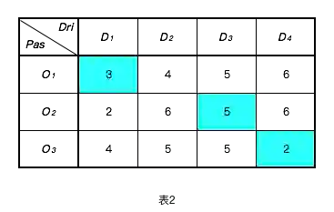 如下图表2所示,依次按照O1、O2、O3顺序去寻找耗时最短的司机,将会得到如下匹配关系:O1-D1、O2-D3、O3-D4,平均耗时约3.3分钟,总共耗时10分钟。